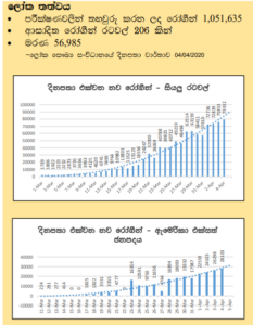 අප්රේල් 4 වනදා වන විට ලෝකයේ රටවල් 206කින් වෛරසය ආසාදනය වූවන් 1051635 දෙනෙකු හමුවී ඇති අතර ලෝකය පුරා මරණ 56985ක් වාර්තා වී තිබේ. වැඩිම ආසාදිතයන් ප්රමාණයක් ඊයේ දිනය තුළ වාර්තා වූ රට ලෙස ලෝක සෞඛ්යය සංවිධානයේ වාර්තා වලට එක් වන්නේ අමෙරිකා එක්සත් ජනපදය වන අතර එම අගය 28103කි.