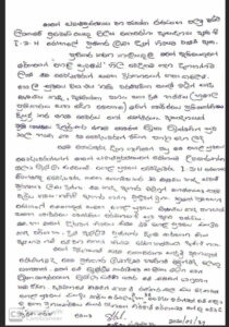පළමු කොරෝනා ආසාදිතයාගේ බිරිය ස්තූති කර එවු ලිපිය පහතින් දැක්වෙයි