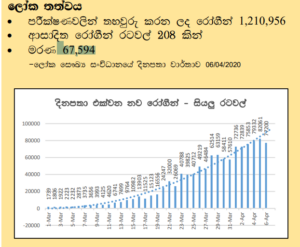 අප්රේල් 6 වනදා වන විට ලෝකයේ රටවල් 207කින් වෛරසය ආසාදනය වූවන් 1,133,758 දෙනෙකු හමුවී ඇති අතර ලෝකය පුරා මරණ 62784ක් වාර්තා වී තිබේ. වැඩිම ආසාදිතයන් ප්රමාණයක් ඊයේ දිනය තුළ වාර්තා වූ රට ලෙස ලෝක සෞඛ්යය සංවිධානයේ වාර්තා වලට එක් වන්නේ අමෙරිකා එක්සත් ජනපදය වන අතර එම අගය 32105කි.