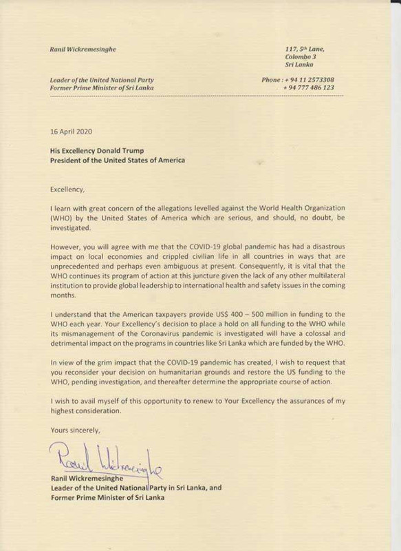 හිටපු අග්රාමාත්යය රනිල් වික්රමසිංහ මහතා අමෙරිකානු ජනාධිපතිවරයා ලෝක සෞඛ්යය සංවිධානයට අමෙරිකාව සපයන ඩොලර් මිලියන 400ත් 500ත් අතර වූ අරමුදල් ප්රමාණය කපා හැරීමට ගත් තීරණය නැවත සලකා බලන ලෙස ඉල්ලා අමෙරිකානු ජනාධිපතිවරයා වෙත ලිපියක් යොමු කර තිබේ. එතුමා විසින් අමෙරිකානු ජනාධිපතිවරයා වෙත යොමු කළ ලිපිය පහත පළවේ.