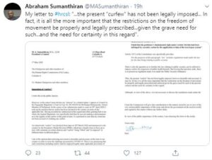 හිටපු පාර්ලිමේන්තු මන්ත්රී එම්.ඒ සුමන්තිරන් ඇඳිරි නීතිය විරුද්ධව මානව හිමිකම් කොමිසමට ගතු කියයි. එම්.ඒ සුමන්තිරන් විසින් කොරෝනා වෛරසය පාලනයට ඇඳිරිනීතිය පැනවීම මානව හිමිකම් කඩවීමක් බවට සඳහන් කරමින් ශ්රී ලංකා මානව හිමිකම් කොමිසමට ලිපියක් යොමු කර තිබේ.