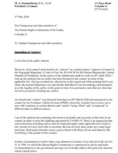 එසේම හිටපු පාර්ලිමේන්තු මන්ත්රී රන්ජන් රාමනායක ඇඳිරි නීතිය කඩ කිරීමට අදාළව අත්අඩංගුවට ගත් අවස්ථාවේදී ඔහුට ඇප ලබා ගැනීමේදී තමන් මේ පිළිබඳ තර්ක කළ බවද සුමන්තිරන් සිය ලිපියෙන් මානව හිමිකම් කොමිසමේ අවදානය යොමු කරනු ලැබ තිබේ.