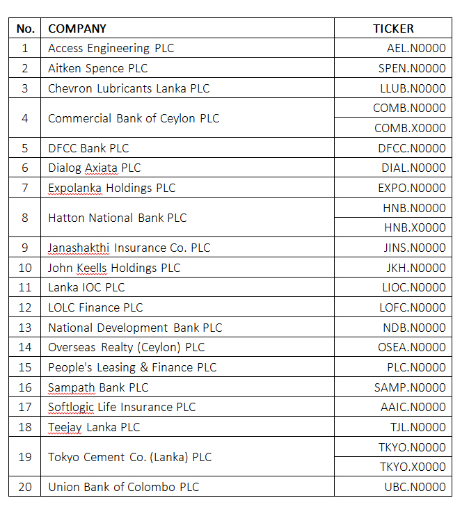 S&P ශ්රී ලංකා 20 දර්ශකය සඳහා අදාළ වන කොටස් සමුහයන් (නිෂ්ඡන්ද කොටස් ද ඇතුළුව) පහත පරිදි වේ.