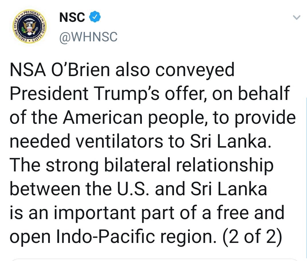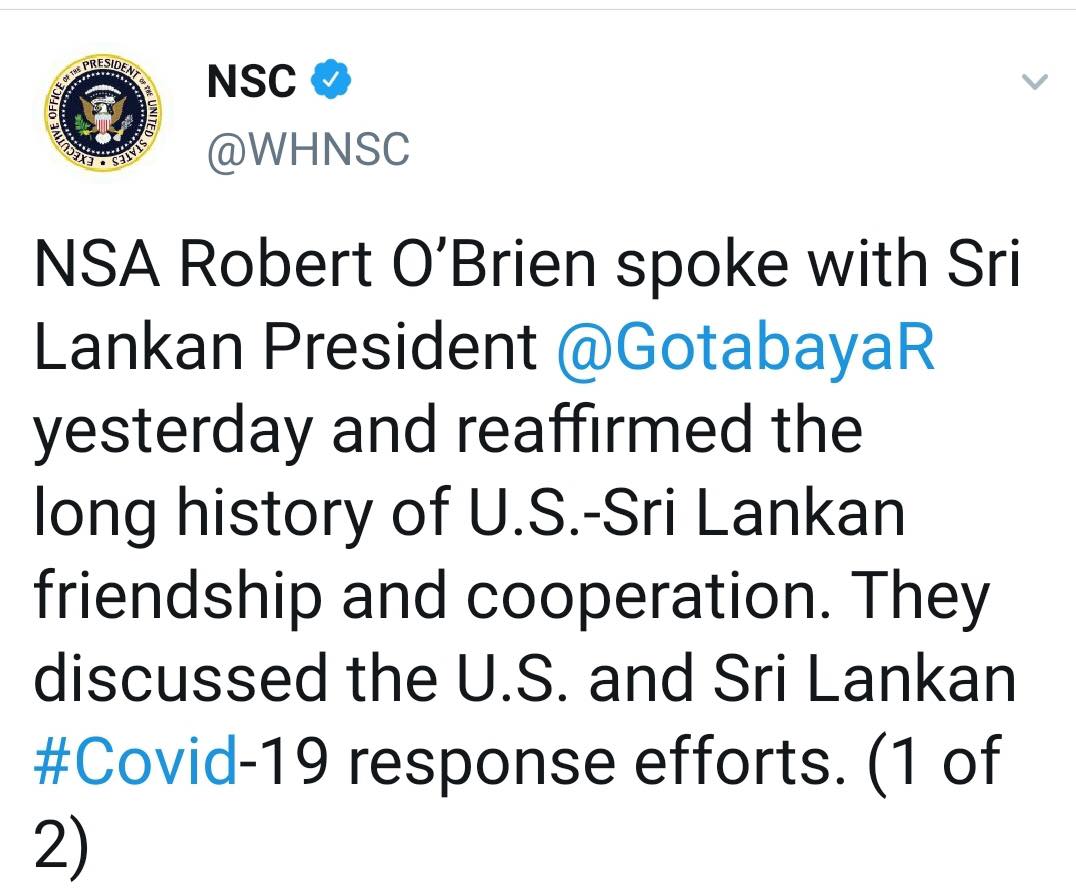 අමෙරිකානු ආරක්ෂක කවුන්සිලයේ නිල ට්විටර් ගිණුමේ සඳහන් කර ඇත්තේ එරට ආරක්ෂක උපදේශක රොබට් ඕ බ්රයන් විසින් ජනාධිපති ගෝඨාභය රාජපක්ෂ මහතා අතර මේ සම්බන්ධයෙන් සාකච්ජා කොට ඇති බවයි.