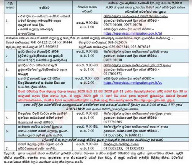 මීට අමතරව ගමන් බලපත්ර තොරතුරු සංශෝධනය, පුරවැසිභාවය ලියාපදිංචි කිරීම, ඉන්දීය සහ චීන සම්භවයක් සහිත පුද්ගලයින්ගේ පුරවැසිභාවයට අදාළ කටයුතු, ගමන් බලපත්ර දත්ත පිටුවේ තොරතුරු සකස් කරගැනිම සහ ගමන් බලපත්ර දත්ත පිටුවේ හා පිටසන්වල අරාබි පරිවර්තනයක් ලබාගැනිමේ කටයුතු උදෑසන 9.00 සිට පස්වරු 1.00 දක්වා ක්රියාත්මක කෙරෙන බව ද ආගමන විගමන දෙපාර්තමේන්තුව සඳහන් කළේය.