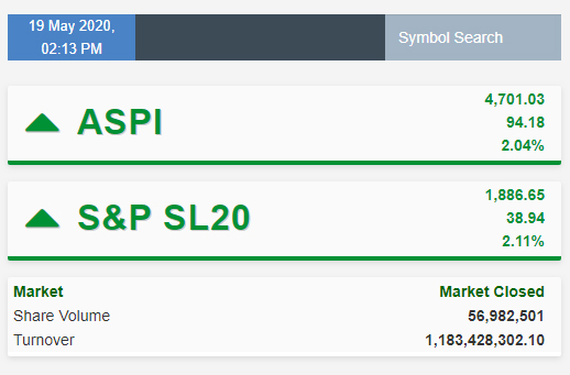 මෙහිදී පූර්ව ගනුදෙනු දිනයට සාපේක්ෂව සියලු කොටස් මිල දර්ශකය ඒකක 94.18 කින් හෙවත්, 2.04% කින් ඉහළ ගොස් ඒකක 4,701.03 ක් ලෙසින් සටහන් වූ අතර S&P SL20 දර්ශකය ඒකක 38.94 කින් ඉහළ ගොස් ඒකක 1,886.65 ක් ලෙසින් සටහන් විය. ඒ අනුව S&P SL20 දර්ශකය අද දින 2.11 % කින් ඉහළ ගොස් ඇත.