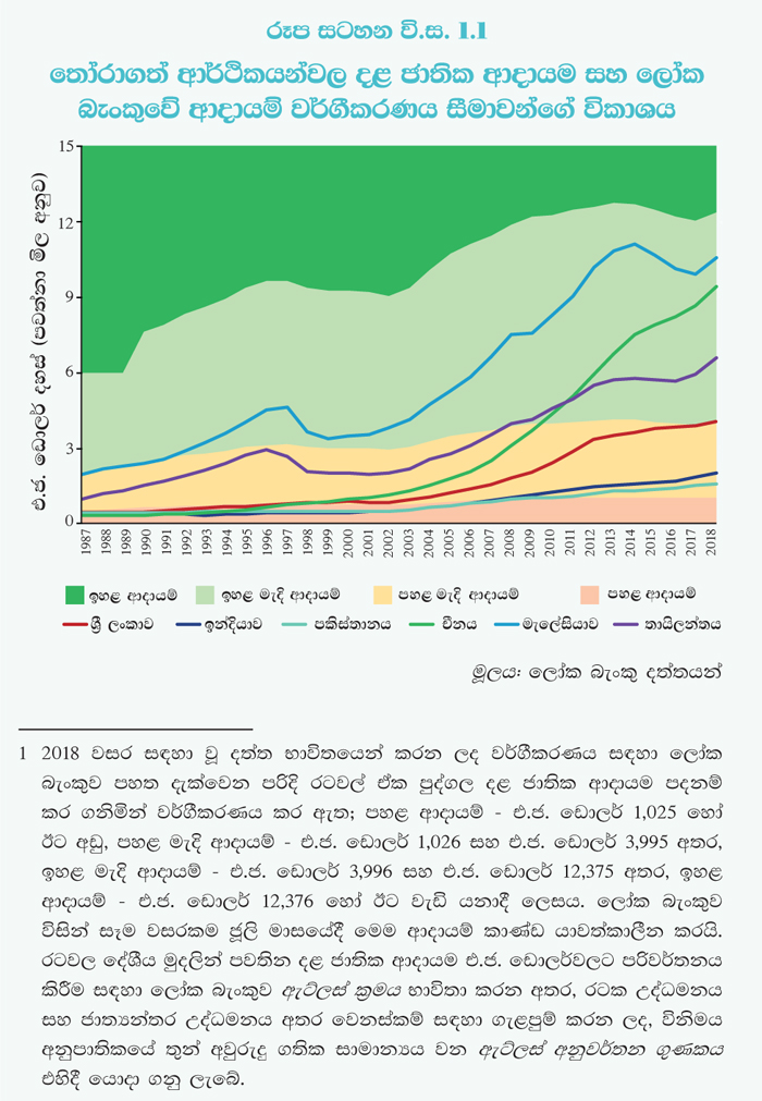මෙම වර්ගීකරණයට අනුව, ශ්රී ලංකාව 1997 වසරේ දී පහළ ආදායම් කාණ්ඩයේ තත්ත්වයෙහි සිට පහළ මැදි ආදායම් කාණ්ඩයේ රටක් දක්වා උසස් විය. එතැන් සිට, 2004 වසරේ දී සිදු වූ සුනාමි ව්යසනය, 2009 වසරේ දී අවසන් වන තෙක් සිවිල් ගැටුම් උත්සන්න වීම්, අතිශයින් අහිතකර කාලගුණික තත්ත්වයන් හා ඒ ආශ්රිත ස්වාභාවික ආපදා පැවති කාලපරිච්ඡේද සම සමාජයීය-ආර්ථික හා දේශපාලනික වෙනස්කම් යනාදී අභියෝගාත්මක කාලපරිච්ඡේදයන් පසු කරමින් ශ්රී ලංකාව ඉදිරියට ගමන් කර ඇත. එවැනි අවහිරතාවන්ගෙන් සාර්ව ආර්ථිකය මත අහිතකර බලපෑම් එල්ල වුවද, පහළ මැදි ආදායම් තත්ත්වයට උසස්වීමේ සිට දළ දේශීය නිෂ්පාදිතයේ වර්ධනය සාමාන්ය වශයෙන් සියයට පහකට වඩා වැඩි අගයක් වාර්තා කරමින් ශ්රී ලංකාව මැදි ආදායම් කාණ්ඩය දක්වා ළඟා විය.