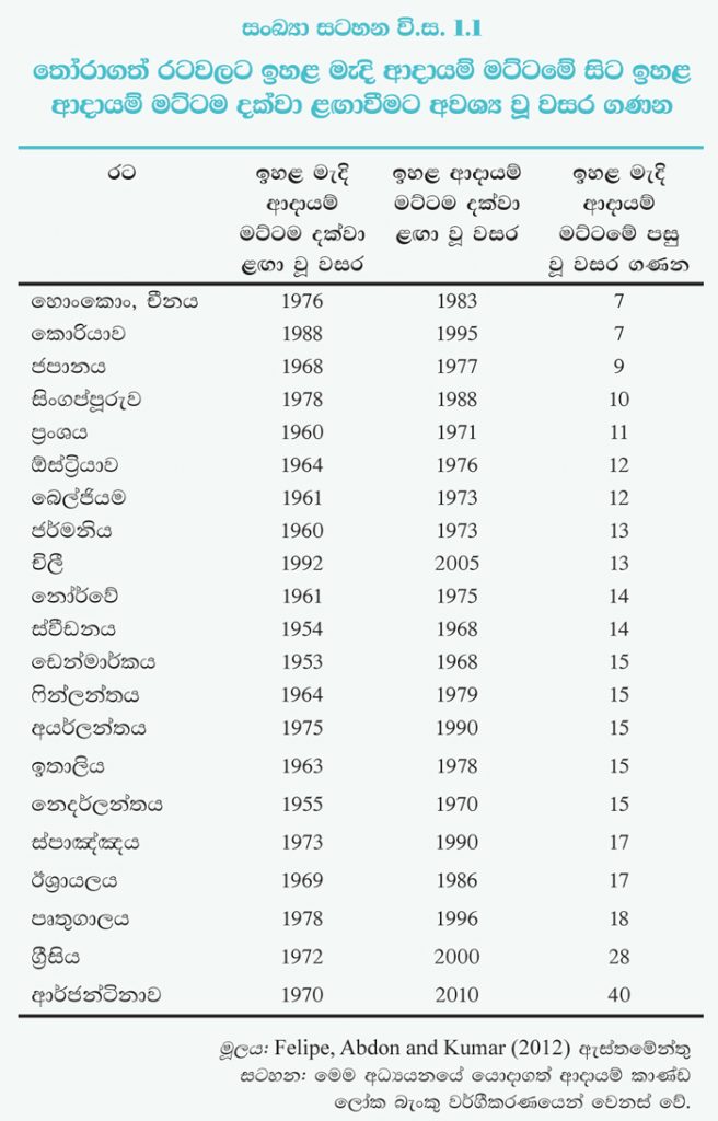 කෙසේ වෙතත්, පහළ මැදි ආදායම් කාණ්ඩයේ සිට ඉහළ මැදි ආදායම් මට්ටම දක්වා ළඟා වීමට ශ්රී ලංකාව වසර 21ක කාලයක් ගත කර ඇති අතර, එය සමහර නැගී එන වෙළෙඳපොළ ආර්ථිකයන් සහිත රටවල් හා සැසඳීමේ දී සාපේක්ෂ වශයෙන් දීර්ඝ කාලයක් ලෙස සැලකිය හැකිය. එබැවින්, මැදි ආදායම් මට්ටම්වල දිගු කාලයක් රැඳී සිටීමට සිදුවීමේ තත්ත්වය ,එනම් මැදි ආදායම් උගුලට (middle income trap) හසුවීම වළක්වා ගනිමින්, ඉදිරි කාලයේ දී ශක්තිමත් වර්ධන ගම්යතාවක් තිරසාරව පවත්නා ගැනීම සහතික කිරීම සඳහා ශ්රී ලංකාව අවශ්ය ව්යූහාත්මක ප්රතිසංස්කරණ කාලීනව හඳුන්වා දීම අත්යාවශ්ය වේ.