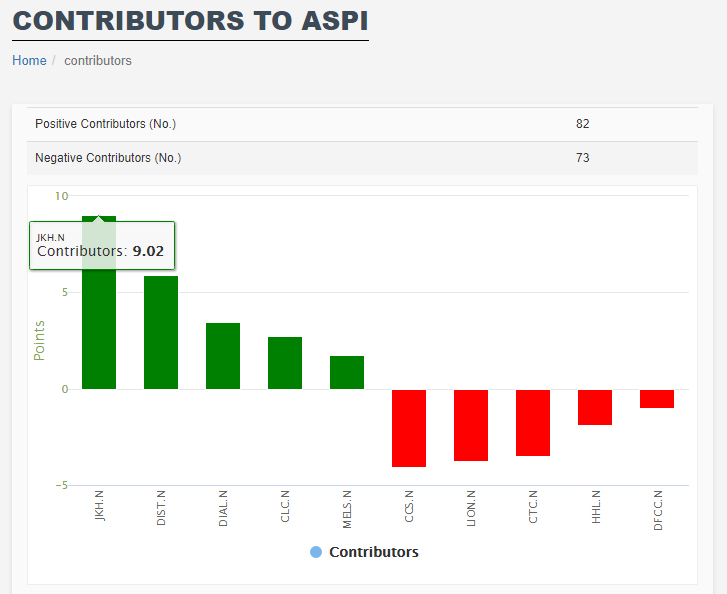 සියලු කොටස් මිල දර්ශකයේ ඉහළ යාම සඳහා ජෝන් කීල්ස් හෝල්ඩිංග්ස්, ඩිස්ටිලරීස් සහ ඩයලොග් ඇතුළු සමාගම් 82 ක් ධනාත්මත දායකත්වයක් ලබා දෙන ලදී.
