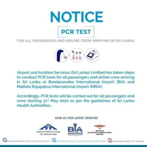 ශ්රී ලංකාවේ සෞඛ්ය බලධාරීන්ගේ උපදෙස් පරිදි ශ්රී ලංකාවට ගුවනින් පැමිණෙන සියළු මගීන්ගේ සහ ගුවන් සේවා කාර්ය මණ්ඩලය සඳහා PCR පරීක්ෂණ සිදු කිරීමට ගුවන්තොටුපළ බලධාරීන් තිරණය කොට ඇත.