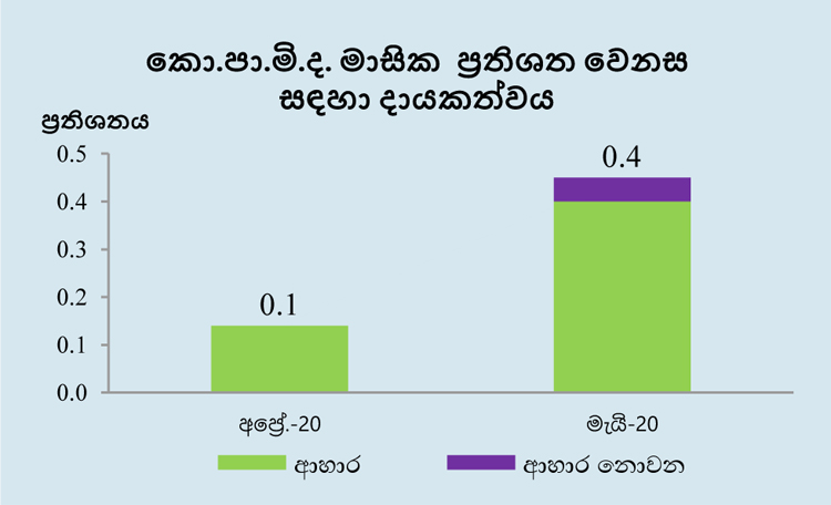 2020 මැයි මාසයේ දී කො.පා.මි. දර්ශකයෙහි මාසික වෙනස සියයට 0.4ක් ලෙස වාර්තා වූ අතර ආහාර හා ආහාර නොවන කාණ්ඩවල අයිතමයන් හි දක්නට ලැබුණු මිල ඉහළ යෑම මේ සඳහා හේතුවිය. 2020 මැයි මාසයේ දී ආහාර කාණ්ඩයෙහි අයිතමවල මිල ගණන් හි ඉහළ යෑමක් වාර්තා වූ අතර, ප්රවාහන සහ විවිධ භාණ්ඩ හා සේවා යන උපකාණ්ඩයන් හි අයිතමවල මිල ගණන් හි ඉහළ යෑම් ඒ සඳහා හේතුවිය.