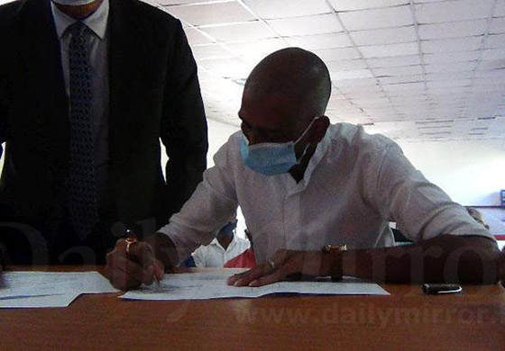 ශ්රී ලංකා පොදුජන පෙරමුණේ නිලධාරීන් සහ නීතිඥ මඩුල්ලක් ඉදිරියේ ඔහු නාමයෝජනා පත්රයට අත්සන් තබා තිබේ.