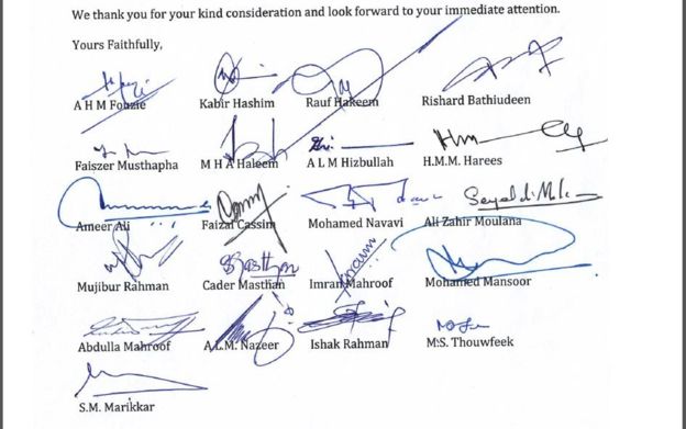 එම ඉල්ලීම කරමින් මාර්තු 24 වෙනිදා යවන ලද ලිපියට මුස්ලිම් මන්ත්රීවරුන් සහ ඇමතිවරුන් විසි එක් දෙනෙකු අත්සන් තබා ඇත.