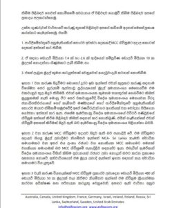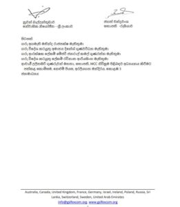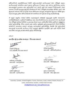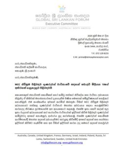 ගෝලීය ශ්රී ලාංකික සංසදයේ විධායක සභාව විසින් අත්සන්කොට ජනාධිපති ගෝඨාභය රාජපක්ෂ මහතාවෙත යවන ලද ලිපියක් මගින් MCC ගිවිසුමට අදාල මූලික ගිවිසුම් අත්සන් කිරීම මගින් ලබා ගත් බවට ගුණරුවන් කමිටුව විසින් මතු කරන ඩොලර් මිලියන 10ක ගනුදෙනුව පිළිබඳ පරීක්ෂණයක් සිදු කරන ලෙස ඉල්ලා ඇත.