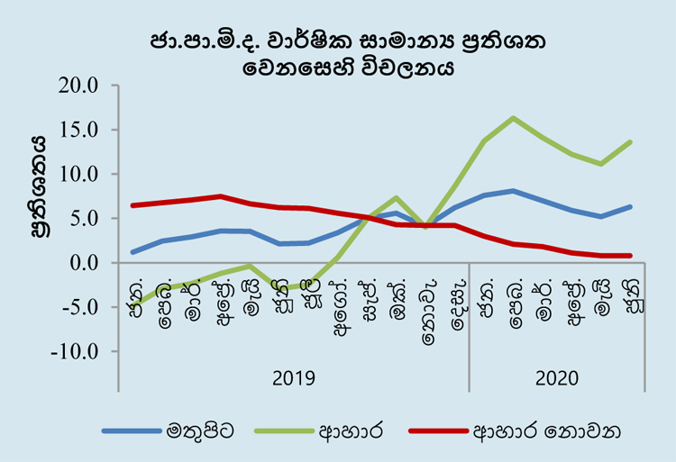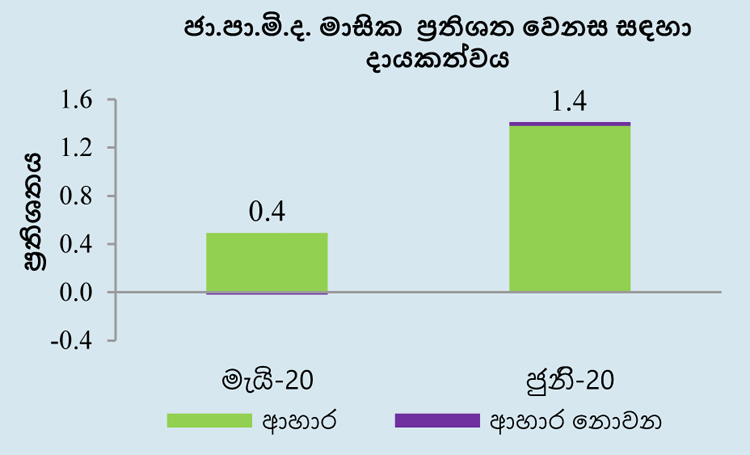 2020 ජූනි මාසයේ දී ජා.පා.මි. දර්ශකයෙහි මාසික වෙනස සියයට 1.4ක් ලෙස වාර්තා වූ අතර, ආහාර කාණ්ඩයේ අයිතමවල මිල ගණන් ඉහළ යෑම් මේ සඳහා බලපාන ලදී. ඒ අනුව 2020 ජූනි මාසයේ දී ආහාර කාණ්ඩයෙහි එළවළු, සීනි, මාළු, බිත්තර සහ සහල් ඇතුළත්ව ආහාර අයිතම හතක මිල ගණන් සැලකිය යුතු ලෙස ඉහළ ගියේය.