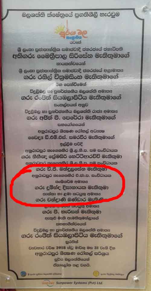 ඇමති රංජිත් සියඹලාපිටිය මහතා අතින් ඊයේ දිනයේදී අනුරාධපුර ශික්ෂණ රෝහලේ විවාත කරන ලද සමරු පළකයේ ඇමති දුමින්ද දිසානායක මහතා නම් කර ඇත්තේ අනුරාධපුර නැගෙනහිර එජාප සංවිධායක ලෙසයි.