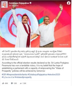 පාර්ලිමේන්තු මැතිවරණයෙන් ශ්‍රී ලංකා පොදුජන පෙරමුණ ජයග්‍රහණය ලබා ගැනීම සම්බන්ධයෙන් ජනාධිපති ගෝඨාභය රාජපක්ෂ මහතා විසින් නිල ෆේස්බුක් ගිණුමේ සටහනක් තබා තිබේ.