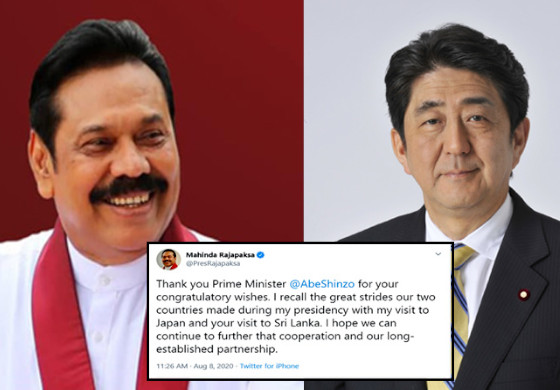 තමා ලැබු මැතිවරණ ජයග්රහණය වෙනුවෙන් සුබ පැතූ ජපාන අගමැති ෂින්ශෝ අබේ වෙත තම ස්තූතිය පළ කිරීමට අග්රාමාත්ය මහින්ද රාජපක්ෂ මහතා කටයුතු කර තිබේ.
