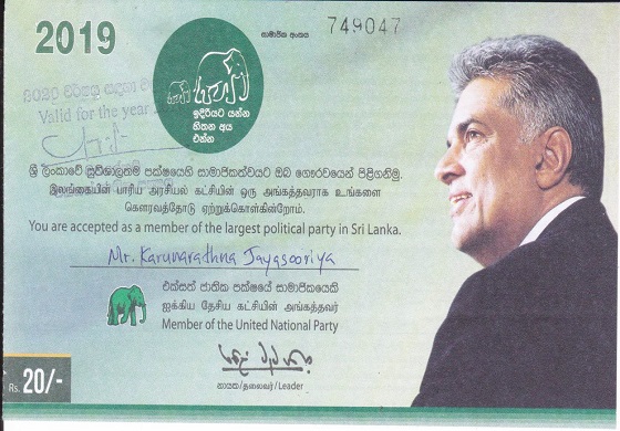 (2020 වසර සඳහා නව සාමාජික කාඩ්පතක් පක්ෂය විසින් මුද්රණය නොකරන ලද අතර 2019 වසර සඳහා මුද්රණය කළ සාමාජික කාඩ්පත් පක්ෂයේ මහලේකම්වරයා විසින් ස්වකීය නිල මුද්රාව තබා අත්සන යෙදීමෙන් පසු 2020 වසර සඳහා වලංගු සාමාජික කාඩ්පත් ලෙස පිළිගන්නා ලදි.)