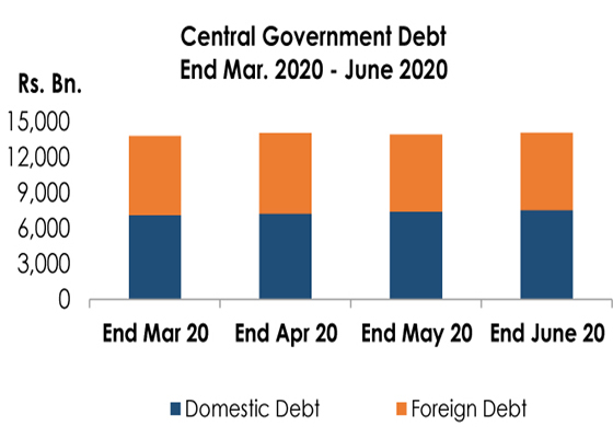 මේ අනුව මධ්යම රජයේ සමස්ත දේශීය ණය ප්රමාණය 2020 මුල් මාස 06 තුළ දී රු. බිලියන 6,629.1 සිට රු. බිලියන 7,530.8 ක් දක්වා සහ සමස්ත විදේශීය ණය ප්රමාණය රු. බිලියන 6,402.4 සිට රු. බිලියන 6,521.4 ක් දක්වා ඉහළ ගොස් තිබේ.