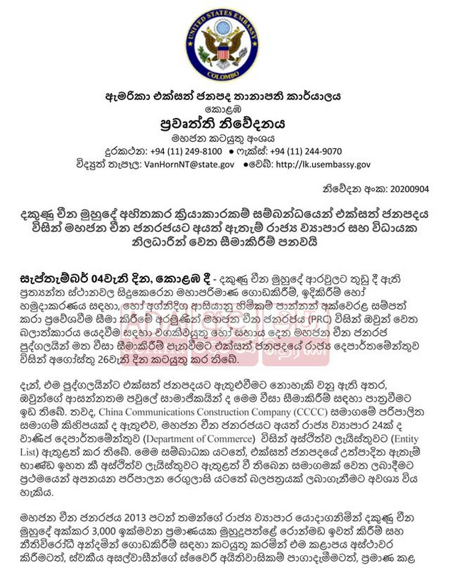 දකුණු චීන මුහුදේ ආරවුලට තුඩු දී ඇති ප්රත්යන්ත ස්ථානවල සිදුකෙරෙන මහාපරිමාණ ගොඩකිරීම්, ඉදිකිරීම් හෝ හමුදාකරණය සඳහා හෝ අග්නිදිග ආසියානු හිමිකම් ඇති වෙරළ සම්පත් කරා ප්රවේශවීම සීමා කිරීමේ අරමුණින් චීන ජනරජය ඔවුන් වෙත බලාත්කාරයේ යෙදවීම සඳහා වගකිවයුතු හෝ සහාය දෙන මහජන චීන ජනරජ පුද්ගලයින් මත වීසා සීමා කිරීම් පැනවීමට එක්සත් ජනපදයේ රාජ්ය දෙපාර්තමේන්තුව අගෝස්තු 26 වන දින කටයුතු කර ඇතැයි ද එම නිවේදනයේ වැඩිදුරටත් දැක්වේ.