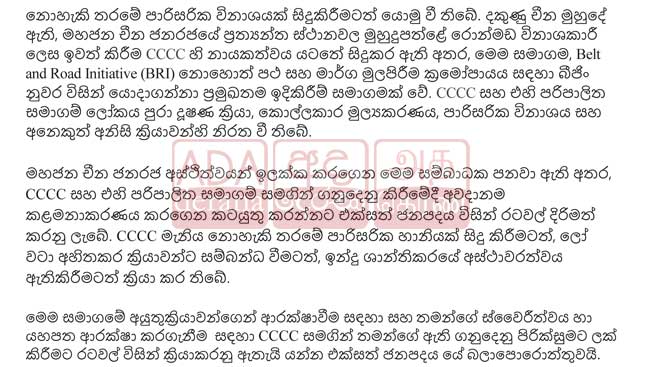 CCCC මැනිය නොහැකි තරමේ පාරිසරික හානියක් සිදුකිරීමටත්, ලෝ වටා අහිතකර ක්රියාවන්ට සම්බන්ධ වීමටත්, ඉන්දු ශාන්තිකර අස්ථාවරත්වය ඇති කිරීමටත් ක්රියා කර ඇතැයි ද එහි සඳහන් ය.
