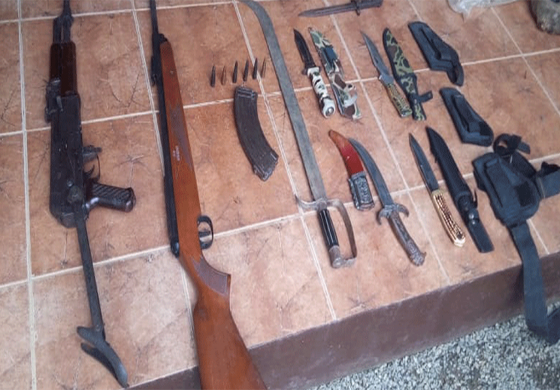 T56 ගිනි අවියක්,පතරොම් ගැබක්,T 56 උණ්ඩ 8ක්, අත් බෝම්බයක්,රම්බෝ පිහි 4ක්, ලියා පදිංචි නොකල යතුරු පැදියක්, වායු රයිෆලයක්, රේල් පිලි දෙකක් මෙසේ අත්අඩංගුවට ගෙන ඇත.