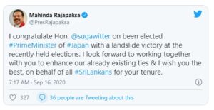 ජපානයේ නව අග්රාමාතය ලෙස තේරී පත්වූ යොෂිහිඩේ සුගා මහතා වෙත අග්රාමාත්ය මහින්ද රාජපක්ෂ මහතා සුබ පැතුම් පණිවිඩයක් යොමුකර තිබේ.