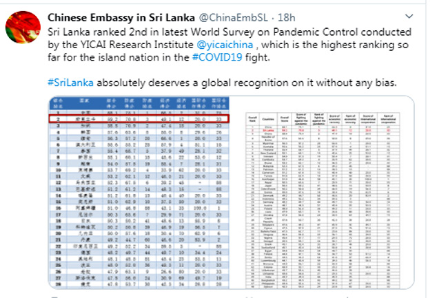 චීන මූල්ය බුද්ධි ආයතනයක් වන “යීකායි” පර්යේෂණ ආයතනය සිදුකළ සමීක්ෂණයකට අනුව කොවිඩ් – 19 ගෝලීය වසංගතය වැළැක්වීමේ ක්රියාමාර්ග, ආර්ථිකය ප්රකෘතිමත් කිරීම සහ ජාත්යන්තර සහයෝගීතාව සැළකූ විට ශ්රී ලංකාව ලොව දෙවැනි ස්ථානයට පත්ව තිබේ.