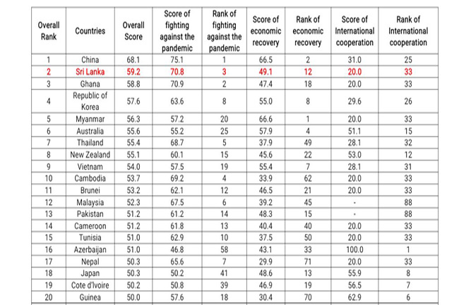 චීන පර්යේෂණ ආයතනයක් සිදුකළ සමීක්ෂණයකට අනුව කොවිඩ් – 19 ගෝලීය වසංගතය පාලනයෙන් ශ්රී ලංකාව ලොව දෙවැනි ස්ථානයට පත්ව තිබේ.