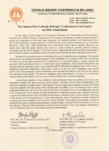 20 වන ව්යවස්ථා සංශෝධනය ඉදිරියට රැගෙන නොයන ලෙසත් නව ව්යවස්ථාවක් සකස් කිරීමට මේ අවස්ථාවේ ප්රමුඛතාව ලබාදෙන ලෙසත් කතෝලික රදගුරු සම්මේලනය ඉල්ලීමක් කර තිබේ.