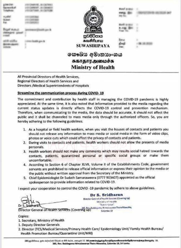 මාධ්යට කොවිඩ් තත්ත්වය පිළිබඳව තොරතුරු ලබාදෙන විට එය සිදුවිය යුත්තේ ඊට අදාළ බලයලත් අංශ හරහා පමණක් බව වැඩබලන සෞඛ්ය සේවා අධ්යක්ෂ ජනරාල් එස්. ශ්රීධරන් මහතා සෞඛ්ය සේවකයින් වෙත දන්වා සිටී.