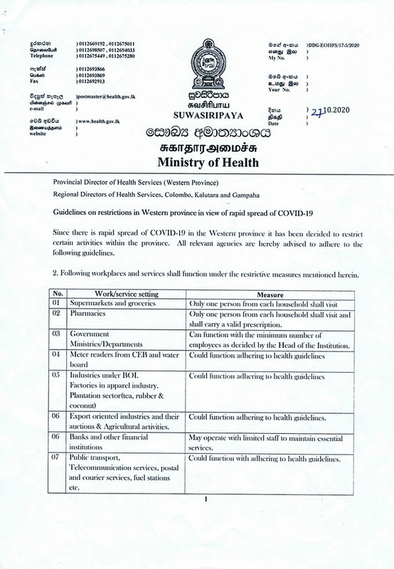 එහි දැක්වෙන ආකාරයට විවෘත පොළවල්, ආර්ථික මධ්යස්ථාන, රූපලාවණ්යාගාර, සහ මහජන ඒකරාශීවීම් බස්නාහිර පළාත තුළ නැවත දැනුම් දෙනතුරු අත්හිටුවා තිබේ.