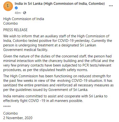 කොළඹ පිහිටි ඉන්දීය මහ කොමසාරිස් කාර්යාලයේ කාර්ය මණ්ඩල සහායකයෙක් කොවිඩ් ආසාදිත බව හඳුනාගත් බව ඉන්දීය මහ කොමසාරිස් කාර්යාලය නිවේදනය කරයි.