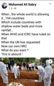 එම ගිනුම මගින් ඔහු වැඩිදුරටත් පවසා සිටින්නේ එක්සත් ජාතික සංවිධානය කොවිඩ්19 වෛරසය ආසාදනයෙන් මිය යන අය භූමදානයට සලකා බලන ලෙසද ඉල්ලීමක් කර ඇති බවත් මෙරට මානව හිමිකම් කොමිසමද එම ඉල්ලීම පිළිගෙන ඇතැයි ද ඔහු සඳන් කර සිටී.