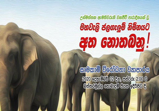 තමා හිරේ දැම්මත් ජලගැලුම් නිම්නය හරහා වසා ඇති මාර්ගය නැවත විවෘත කරන බවට විමලවීර දිසානායක රාජ්ය අමාත්ය තුමා තර්ජණය කරන අතර මෙම පරිසර විනාශයන්ට එරෙහිව අද (02) දින පස්වරු 2.00ට බත්තරමුල්ල සොබා දහම් පියස ඉදිරිපිටදී සාමකාමී විරෝධතාවයක් කිරීමට පරිසරවේදීන් කණ්ඩායම් සැලසුම් කර තිබෙනවා.