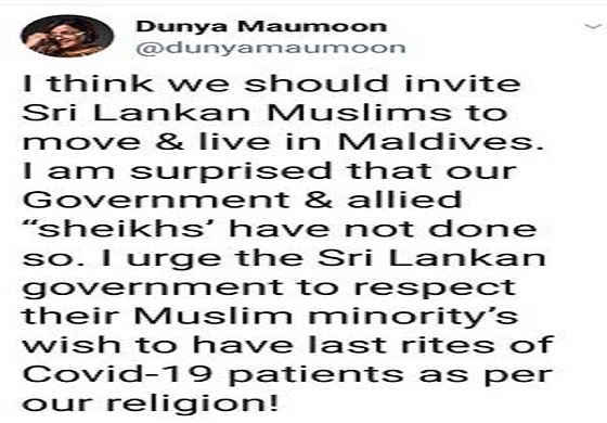 මාලදිවයිනේ හිටපු විදේශ ඇමති දුන්යා මවුමූන් මහත්මිය තම සමාජ ජාල ගිණුමේ සටහනක් තබමින් පවසා සිටින්නේ ශ්රී ලංකාවේ සිටින මුස්ලිම් ජාතිකයන්ට මාලදිවයිනේ පදිංචියට එන්නැයි ආරාධනා කළ යුතු බව පවසා සිටී.