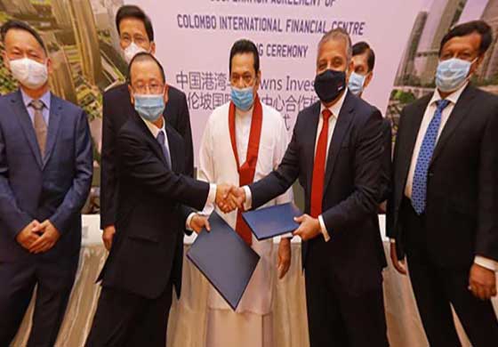 මිශ්ර සංවර්ධන ව්යාපෘතියක් ලෙස ක්රියාත්මක කොළඹ ජාත්යන්තර මූල්ය මධ්යස්ථාන (CIFC) ගිවිසුම අත්සන් තැබීමේ අවස්ථාවට අග්රාමාත්ය මහින්ද රාජපක්ෂ මහතා සමඟ ශ්රී ලංකාවේ චීන තානාපති චි ජෙන්හොං මහතා ද එක්ව සිටියේය.