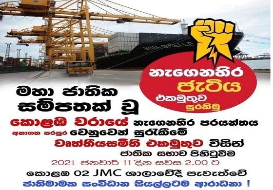 ඒ අනුව කොළඹ වරායේ නැගෙනහිර පර්යන්තය අනාගත පරපුර වෙනුවෙන් සුරැකීමේ සුරැකීමේ වෘත්තීය සමිති එකමුතුව “නැගෙනහිර පර්යන්තය සුරැකීමේ ජාතික සභාව පිහිටවීමේ ” කාර්ය සාර්ථක කර ගැනීමට දේශ මාමක සියළු දෙනාම මෙම අවස්ථාවට සහභාගි වන ලෙස ඉල්ලා සිටින බව ලංකා ලීඩ් වෙබ් අඩවියට අදහස් දක්වමින් පවසා සිටියහ.