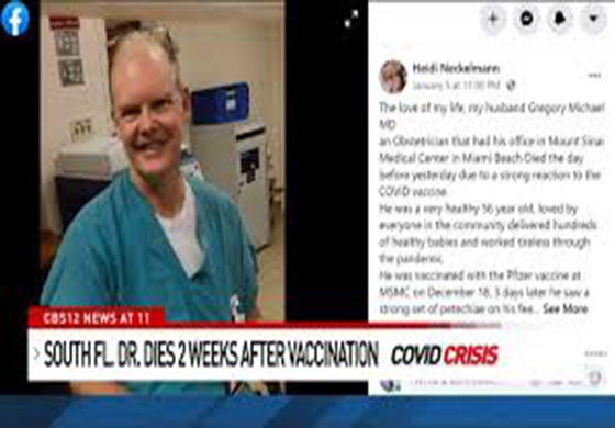 මියගිය වෛද්ය ග්රෙගරි මයිකල්ගේ බිරිය පවසන්නේ Pfizer BioNtech එන්නත ලබාගැනීමෙන් දින 3කට පසු එනම් 2020 දෙසැම්බර් 21 දින ඇතිවූ රෝගී තත්වය හේතුවෙන් ඔහුව එන්නත ලබාගත් මියාමි Mount Sinai Medical Center රෝහලට අතුලත් කරන අවස්ථාව වනවිටත් ඔහුගේ “රුධිර පරීක්ෂණ වාර්තාවේ Pfizer BioNtech එන්නත නිසා ඇතිවූ දැඩි සංකීර්ණ ව්යාකූලතා පෙන්වූ බව”ත් ඔහුව සුවපත් කරගැනීමට අතිදක්ෂ වෛද්යවරුන් කණ්ඩායමක් විසින් දරණ ලද උත්සාහය නිෂ්ඵල කරමින් ඔහු 2021 ජනවාරි 03වන දින මියගිය බවත්ය.