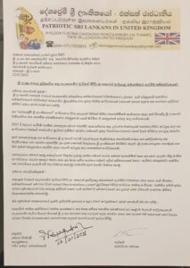 එහිදී දේශප්රේමි ශ්රී ලාංකිකයෝ සංවිධානයේ නිලධාරින් විසින් ශ්රී ලාංකාවෙ ජනාධිපති ගෝඨාභය රාජපක්ෂ මැතිතුමා වෙතට භාර දීමට ලිපි දෙකක් භාර දී ඇති බවද වාර්තාවේ. මේ අවස්ථාවට දේශප්රේමි ශ්රී ලාංකිකයෝ සංවිධානයේ සභාපති වජිර කමල් සමරක්කොඩි මහතා එහි ලේකම් පතිරණ මහතා සහ ජගත් ගැමුණු මහතා යන අය සහභගි වූ බව වාර්තාවේ.