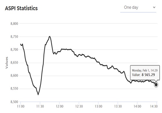 ඊයේ (01) දිනයේ දී අඛන්ඩව දෙවැනි දිනටත් කොළඹ කොටස් වෙළෙඳපොළ මිල දර්ශකයන් හි පහළ යාමක් දක්නට ලැබුණි. ඒ අනුව සියලු කොටස් මිල දර්ශක අගය ඒකක 101.0 කින් ඊයේ දිනයේ දී පහළ ගොස් දිනය අවසානයේ දී ඒකක 8,567.07 ක් ලෙසින් සටහන් වූ අතර එය පූර්ව ගනුදෙනු දිනය හා සැසඳීමේ දී 1.17% ක පහළ යාමක් බව පැවසේ. කොළඹ කොටස් වෙළෙඳ පොළේ සියළු කොටස් දර්ශකයන්ගේ දැවැන්ත මිළ පහළ යාමක් පසුගිය ජනවාරි 29 දිනයේ දී ද දක්නට ලැබුණි. එය ඒකක 143.94 ක දැවැන්ත පහළ යාමක් බව පැවසේ.