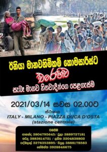 දෙමළ ඩයස්පෝරාවේ උවමනාව මත ජිනීවා මානව හිමිකම් කොමසාරිස්වරිය විසින් ශ්රී ලංකාවට එරෙහිව ගෙනා අභූත චෝදනා වලට සහ බලපෑම්වලට එරෙහිව ඉතාලියේ මිලානෝ නුවර ආශ්රිතව ජීවත්වන ශ්රී ලාංකික දේශප්රේමීන් විසින් සංවිධානය කරණු ලබන උද්ඝෝෂණය මාර්තු මස 14 වනදා පස්වරු 02:00 ට මිලානෝ නගරයේ PIAZZA DUCA D’OSTA(stazione centrale) හිදි පැවැත්වෙන බව සංවිධායක කමිටුව පවසයි. මේ සම්බන්ධයෙන් අදහස් දැක්වූ සංවිධායක මණ්ඩල සාමාජිකයෙකු ලංකා ලීඩ් වෙබ් අඩවිය වෙත පවසා සිටියේ පහත දැක්වෙන දුරකතන අංක අමතා මේ සම්බන්ධයෙන් වැඩි දුර විස්තර දැනගන්නා ලෙසයි.