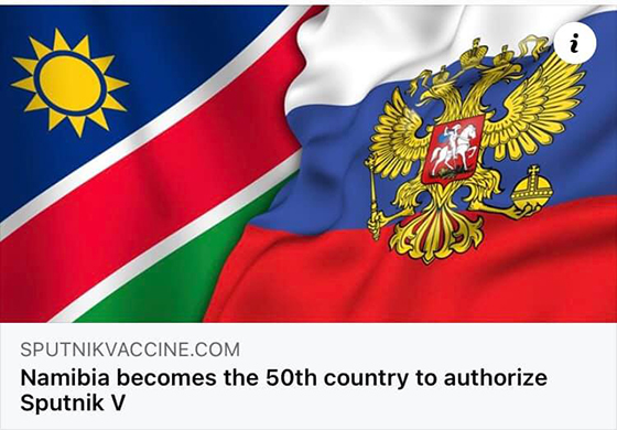 රුසියාවේ ස්පුට්නික් වී (Sputnik V) එන්නත සඳහා අනුමැතිය දුන් 50වන රට බවට නැමීබියාව පත්ව ඇති බව ශ්රී ලංකාවේ රුසියානු තානාපති කාර්යයාලය වාර්තා කරයි.