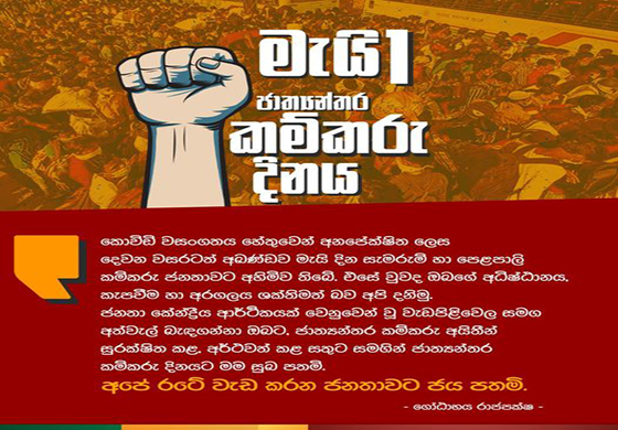 කොවිඩි වසංගතය හේතුවෙන් අනපේක්ෂිත ලෙස දෙවන වසරටත් අඛණ්ඩව මැයි දින සැමරුම් හා පෙළපාලි කම්කරු ජනතාවට අහිමිව තිබේ. එසේ වුවද ඔබගේ අධිෂ්ඨානය, කැපවීම හා අරගලය ශක්තිමත් බව අපි දනිමු. ජනතා කේන්ද්රීය ආර්ථිකයක් වෙනුවෙන් වූ වැඩපිළිවෙල සමග අත්වැල් බැඳගන්නා ඔබට, ජාත්යන්තර කම්කරු අයිතීන් සුරක්ෂිත කළ, අර්ථවත් කළ සතුට සමගින් ජාත්යන්තර කම්කරු දිනයට මම සුබ පතමි.