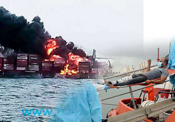 ‘‘ගින්න තවමත් පැතිරෙමින් පවතිනවා. ගින්නේ ස්වභාවය නිසා අනෙකුත් ටග් බෝට්ටු එහෙම ළංවෙලා නෑ. ගින්න නිසා බහාලූම් මුහුදට වැටෙමින් තිබෙනවා. උදේ වෙනකොට 10ක් විතර ගිනි ගැනීමෙන් වැටුණා. තවත් ඒවා ඒ විදිහට වැටෙමින් පවතිනවා, නැවේ පිපිරීම් කිහිපයකුත් වාර්තා වුණා. ඒ නිසා නැවේ හිටපු නාවුකයන් කිහිප දෙනෙකු තුවාල වුණා. මේ නිසා නැවේ සියලූම දෙනාව ඉවත් කරන්න වුණා,” යැයි ආචාර්ය ටර්නි ප්රදීප් කුමාර මහතා පවසයි.
