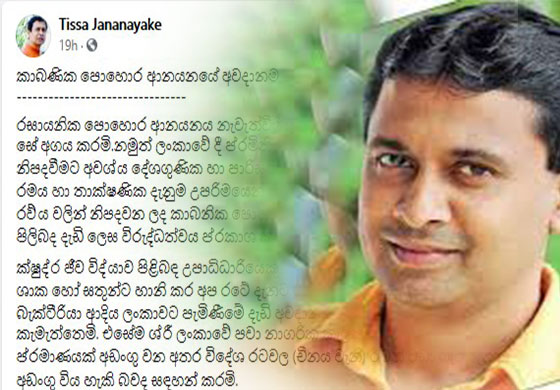 රසායනික පොහොර ආනයනය නැවැත්වීමට රජය ගන්නා ලද තීරණය මහත් සේ අගය කරමි.නමුත් ලංකාවේ දී ප්රමිතියෙන් යුත් කාබනික පොහොර නිපදවීමට අවශ්ය දේශගුණික හා පාරිසරික තත්වයන්ද, අවශ්ය අමුද්රව්ය, ශ්රමය හා තාක්ෂණික දැනුම උපරිමයෙන් තිබියදීත් වෙනත් රටක නාගරික අපද්රව්ය වලින් නිපදවන ලද කාබනික පොහොර ශ්රී ලංකාවට ආනයනය කිරීම පිලිබද දැඩි ලෙස විරුද්ධත්වය ප්රකාශ කරමි.