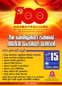 චීන කොමියුනිස්ට් පක්ෂයේ මධ්යයම කාරක සභාවේ ජාත්යයන්තර සබඳතා දෙපාර්තමේන්තුවේ අධ්යයක්ෂක සොන්ග් තාඕ මහතාගේ අනුශාසකත්වයෙන් එම අංශයේ නියෝජ්යය අධ්යයක්ෂකවරයෙකුගේ සහ ශ්රී ලංකාවේ චීන තානාපති ගරු ක්ව්යි සෙන් හොන්ග් මහතාගේ ප්රධානත්වයෙන් චීන කොමියුනිස්ට් පක්ෂයේ 100වන සැමරුම පැවැත්වීමට නියමිත බව ශ්රී ලංකාවේ කොමියුනිස්ට් පක්ෂයේ ලේකම් වෛද්යය ජී වීරසිංහ මහතා පවසයි.