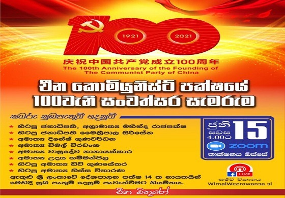 චීන කොමියුනිස්ට් පක්ෂයේ 100 වන සංවත්සරය සැමරීම පිණිස මෙම මස 15 වනදා සවස 04 සිට චීන කොමියුනිස්ට් පක්ෂයේ මධ්යයම කාරක සභාවේ ජාත්යයන්තර සබඳතා දෙපාර්තමේන්තුවේ අධ්යයක්ෂක සොන්ග් තාඕ මහතාගේ අනුශාසකත්වයෙන් එම අංශයේ නියෝජ්යය අධ්යයක්ෂකවරයෙකුගේ සහ ශ්රී ලංකාවේ චීන තානාපති ගරු ක්ව්යි සෙන් හොන්ග් මහතාගේ ප්රධානත්වයෙන් සූම් තාක්ෂණය ඔස්සේ සැමරීමට සියළු කටයුතු සූදානම් කර ඇත. ශ්රී ලංකාවේ කොමියුනිස්ට් පක්ෂය සංවිධාන කටයුතු සිදුකරන මෙම උත්සවයේ සමරු දෙසුම් ග්රාමාත්යය මහින්ද රාජපක්ෂ, හිටපු ජනාධිපති මෛත්රීපාල සිරිසේන, විදේශ අමාත්යය දිනේෂ් ගුණවර්ධන, අමාත්යය විමල් වීරවංශ, අමාත්යය වාසුදේව නානායක්කාර, අමාත්යය උදය ගම්මන්පිල, හිටපු අමාත්යය ඩිව් ගුණසේකර, හිටපු අමාත්යය තිස්ස විතාරණ, අමාත්යය ඩග්ලස් දේවානන්ද ඇතුළු පක්ෂ 14ක නියෝජිතයන් විසින් සිදු කිරීමට නියමිතය. මෙම අවස්ථාව https://fb.me/e/VEk934fp ෆේස් බුක්” වෙබ් අඩවිය ඔස්සේ ලෝකයේ ඕනෑම තැනක සිට නැරඹිය හැකි බව සංවිධයක මණ්ඩලය වෙනුවෙන් ශ්රී ලංකාවේ කොමියුනිස්ට් පක්ෂයේ ලේකම් වෛද්යය ජී වීරසිංහ මහතා පවසයි.