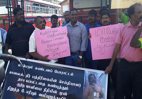 යාපනයේ Kalai kathir,මොනිං රයිස් (Morning rise) පුවත් පතේ සෙල්වරාසා රාජේන්ද්රන් නම් මාධ්යවේදියාට හදුනා නොගත් කණ්ඩායමක් මහ මගදි පහරදි ඝාතනය කිරිමට ගත් උත්සහය වෙබ් මාධ්යවේදීන්ගේ ජාතික ව්යාපාරය දැඩි ලෙස හෙළාදකිමු.